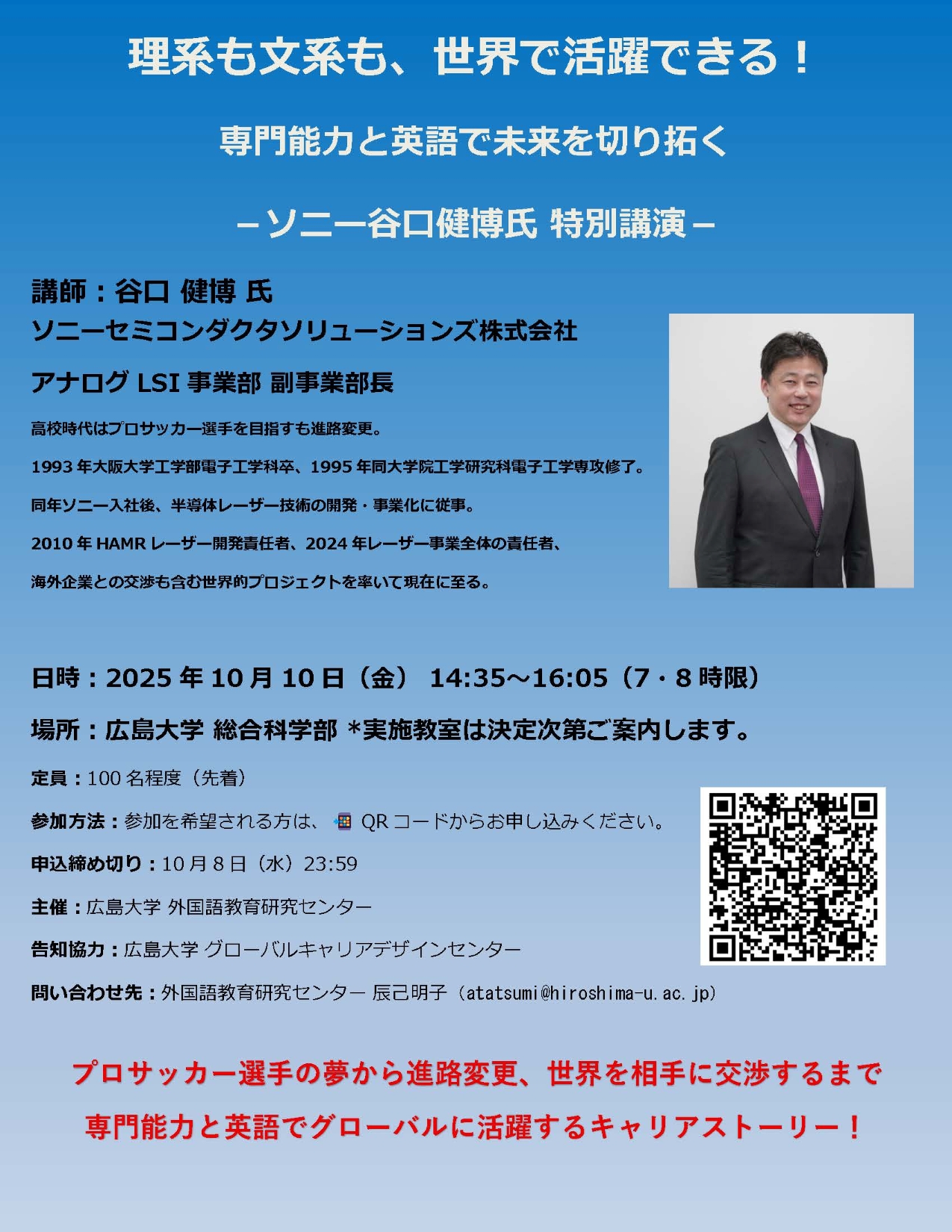 このたび、外国語教育研究センターでは、ソニーセミコンダクタソリューションズ株式会社 アナログLSI事業部 副事業部長の谷口健博氏をお迎えし、特別講演を開催いたします。