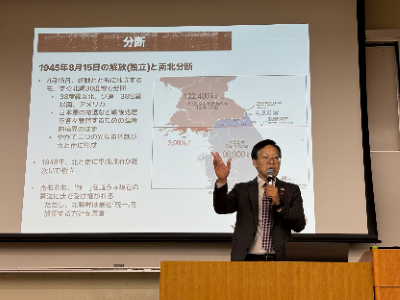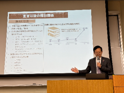 講演では、1945年以後の韓国の政治的・社会的変化が日韓関係にどのような影響を及ぼしてきたのかについて、韓国戦争、経済発展、民主化運動、アジア金融危機とグローバル化など、時代の流れに沿って丁寧に解説されました。とりわけ、1965年の国交正常化、1998年の「金大中・小渕宣言」、そして2024年の人的交流の実態まで、具体的なデータを交えた分析に学生たちは熱心に耳を傾けていました。