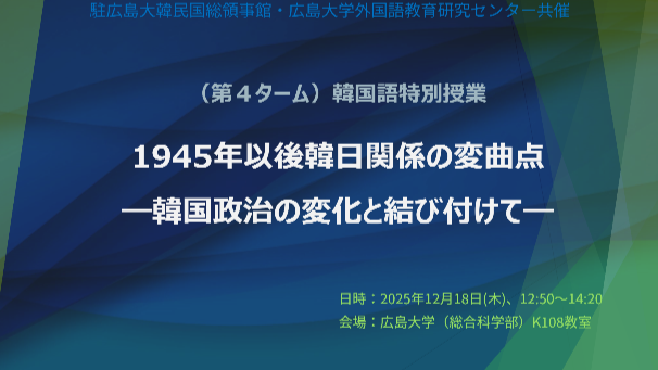 2025年12月18日(木)、本学外国語教育研究センターと駐広島大韓民国総領事館が共催する韓国語の特別授業を実施しました。本特別授業では、駐広島大韓民国総領事・姜鎬曽(カン・ホズン)氏を講師にお招きし、「1945年以後韓日関係の変曲点たち―韓国政治の変化と結び付けて―」をテーマとする講演会を開催しました(会場:総合科学部K108教室)。